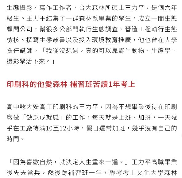 生態攝影、寫作工作者、台大森林所碩士王力平,是個六年級生。王力平結集了一群森林系畢業的學生,成立一間生態顧問公司,幫很多公部門執行生態調查、營造工程執行生態檢核、撰寫生態叢書以及投入環境教育推廣,他也曾在大學擔任講師。「我從沒想過,真的可以靠野生動物、生態學、攝影學活下來。」
