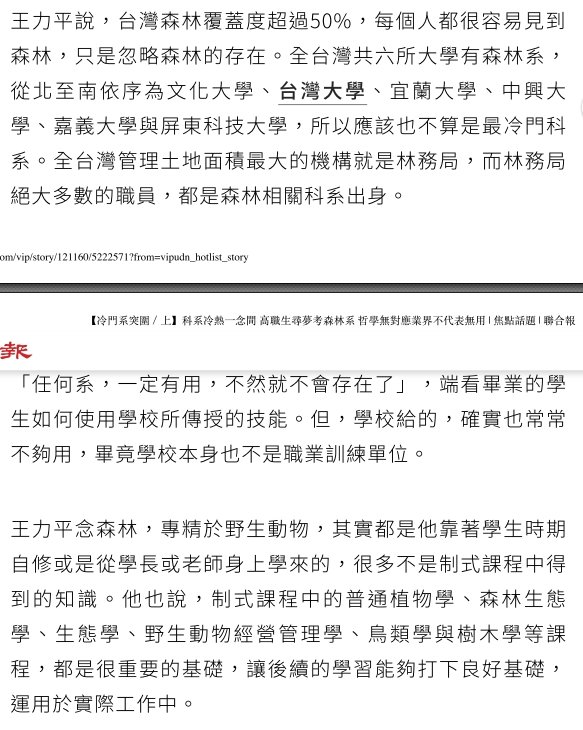王力平說,台灣森林覆蓋度超過50%,每個人都很容易見到森林,只是忽略森林的存在。全台灣共六所大學有森林系,從北至南依序為文化大學、台灣大學、宜蘭大學、中興大學、嘉義大學與屏東科技大學,所以應該也不算是最冷門科系。全台灣管理土地面積最大的機構就是林務局,而林務局絕大多數的職員,都是森林相關科系出身。