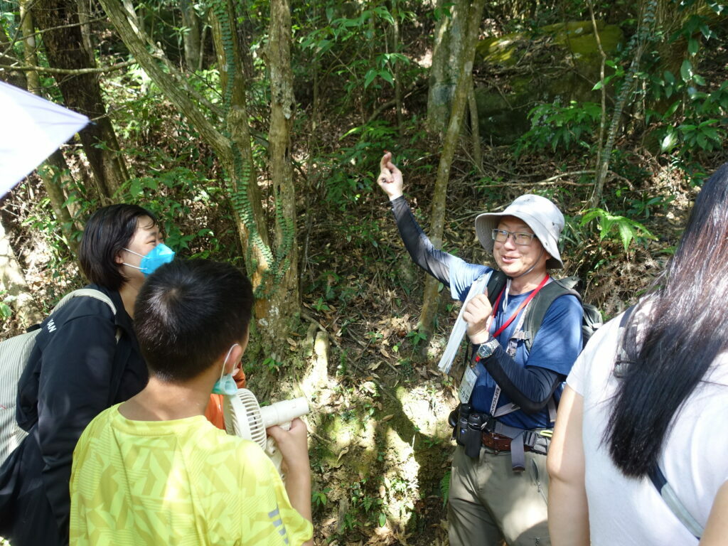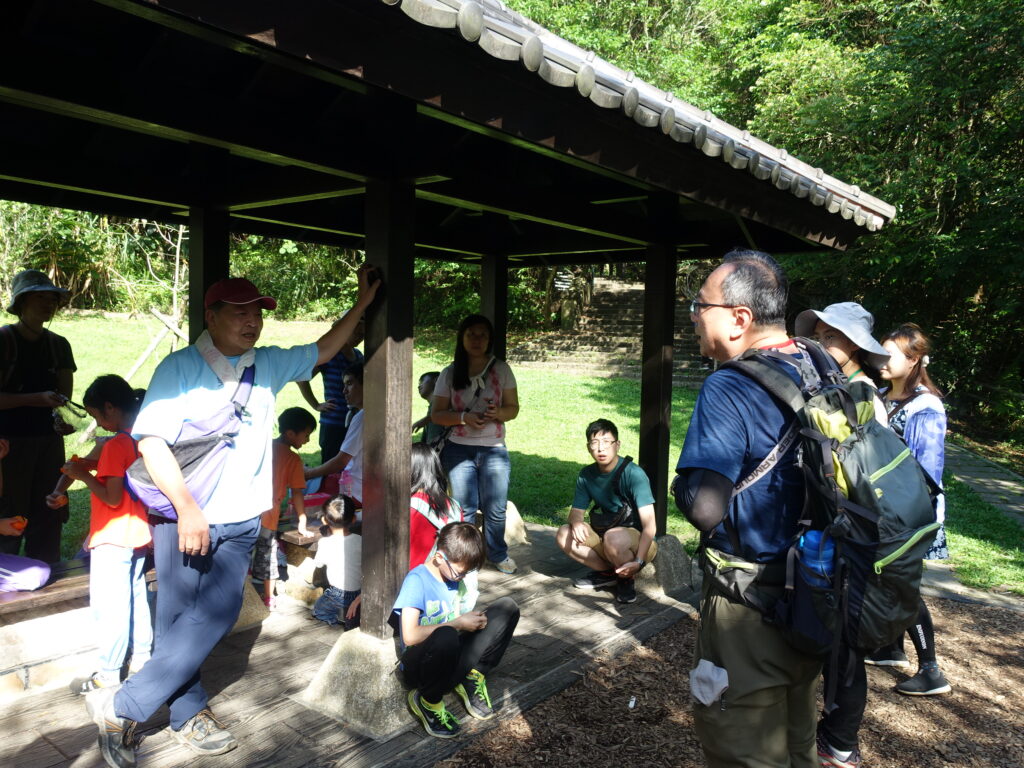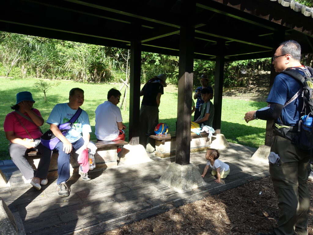 感受完造林地,我們回到步道系統上,在涼亭稍作休息補補水,老刀也為大家簡單整理一下剛才的所見所聞,小小孩不吝嗇地向老刀提出問題。