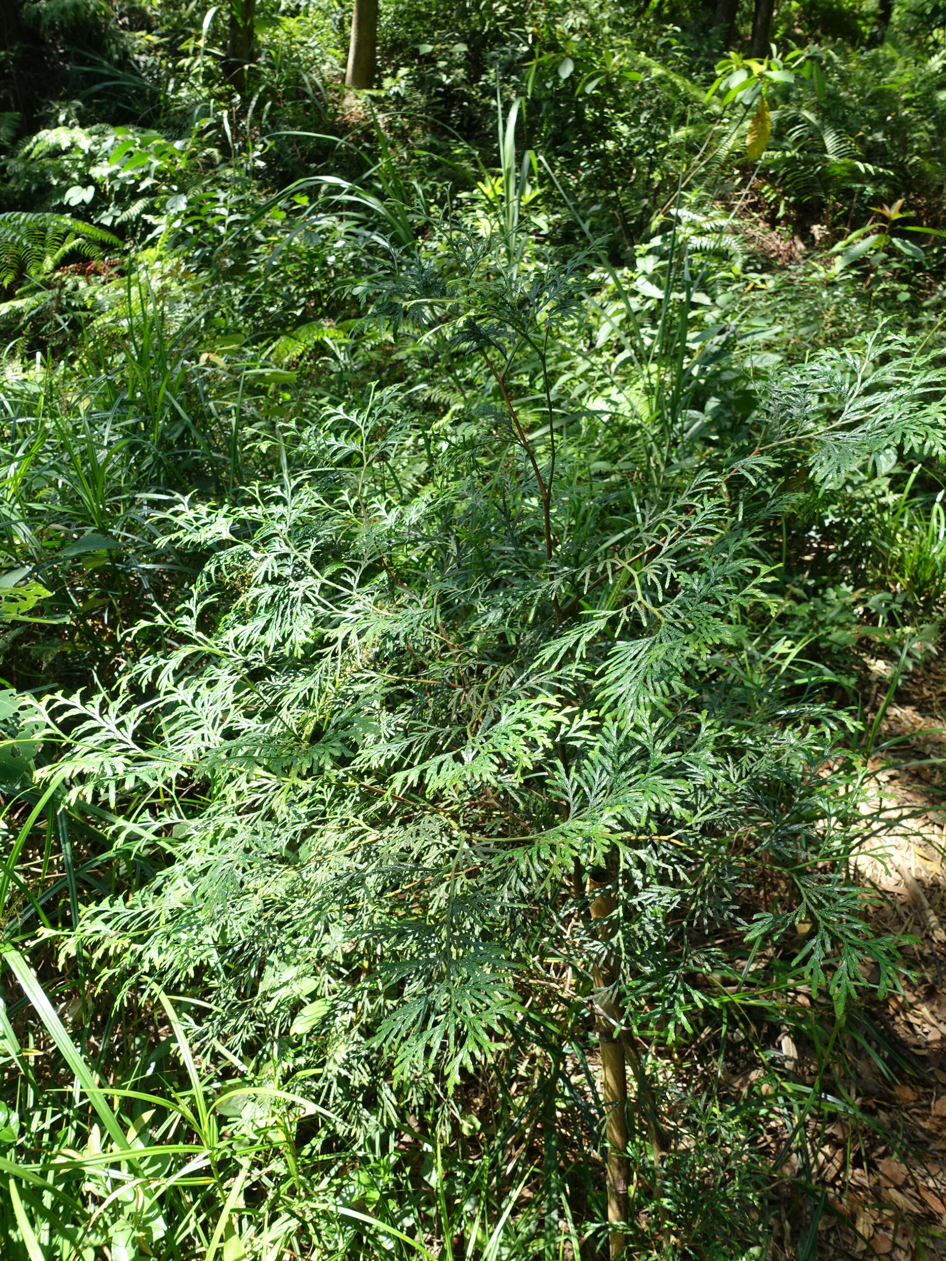 疏伐後的森林主要種植物種是肖楠,每棵被種植的植物旁都必須加上竹竿,以免小樹還沒長大前就被當作雜草除掉了!