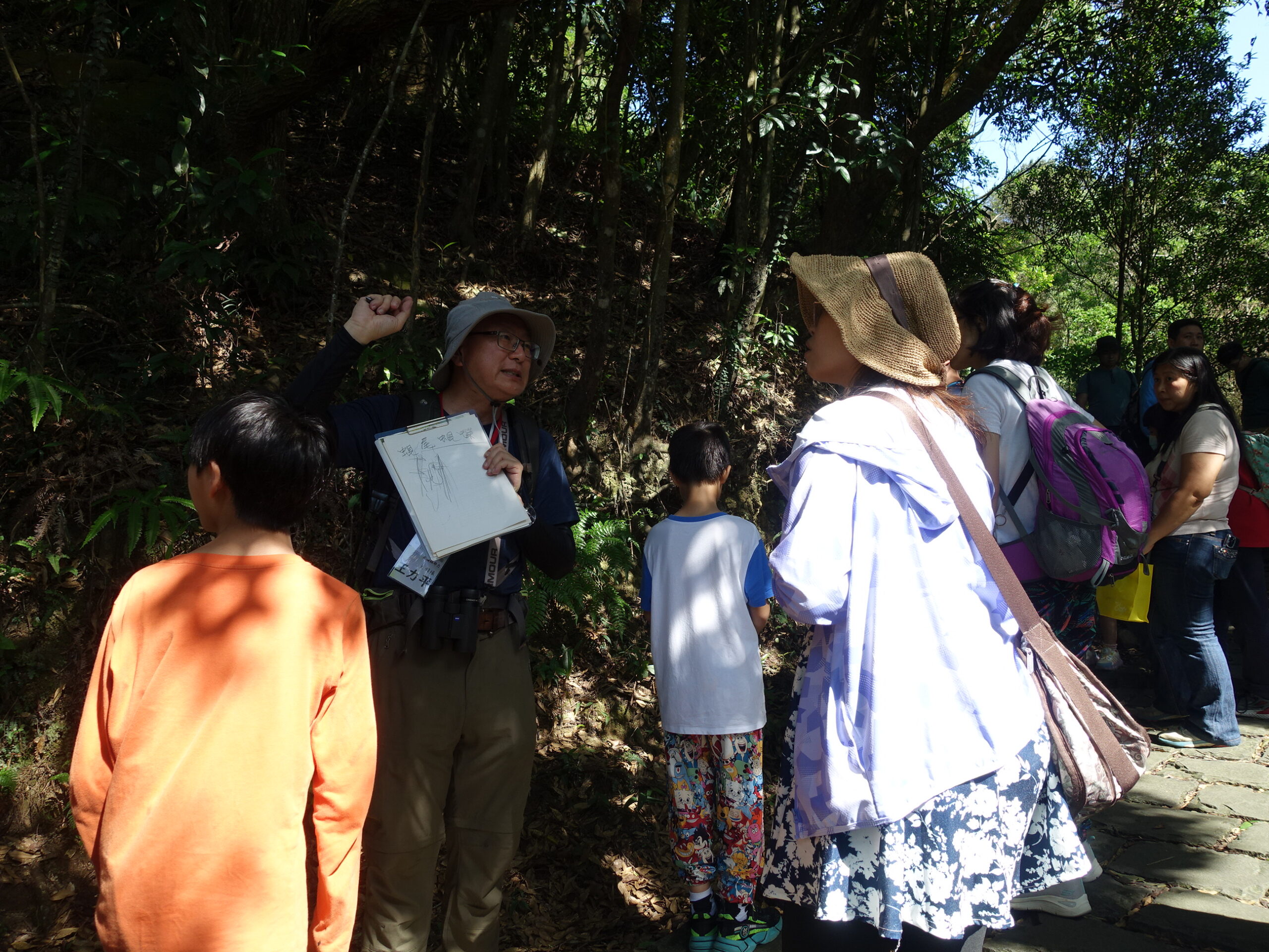 感受完造林地,我們回到步道系統上,在涼亭稍作休息補補水,老刀也為大家簡單整理一下剛才的所見所聞,小小孩不吝嗇地向老刀提出問題。