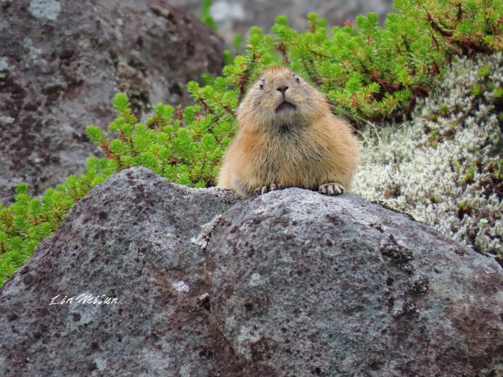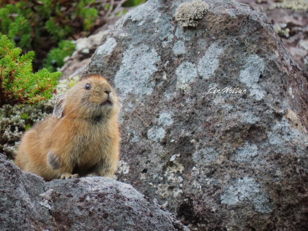 在北海道山林間總是靜悄悄的,偶爾在耳邊響起其他旅人與熊對話的鈴鐺聲,在路途中後段還被虻突襲,當下我以為是虎頭蜂,驚恐的加快腳步,而當我們離開森林到達岩場時,太陽也緊接著露出,就看到一些日本人聚集在岩場某處,而在石頭上趴著的就是蝦夷鼠兔!!!!