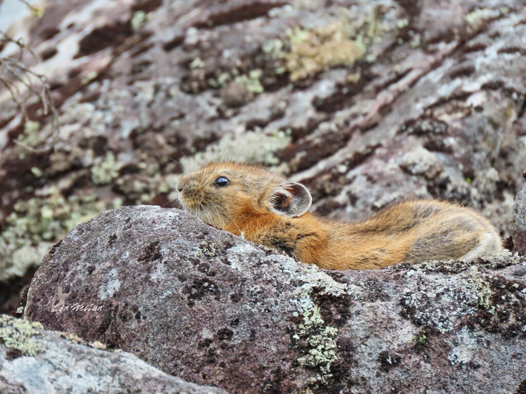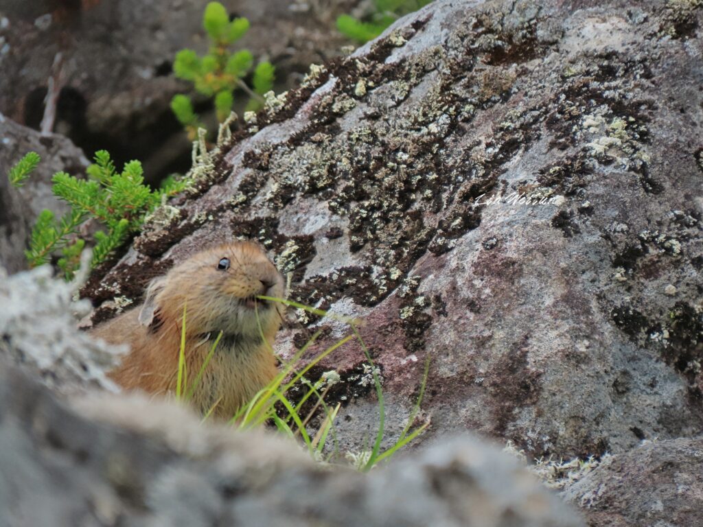 哇塞,出現了耶!!!一開始在石頭趴著,我還以為是哪來的高山老鼠在曬太陽,畢竟他用一種懶散放鬆的姿態攤在那邊,跟一般印象中的鼠兔不太一樣,但這也不妨礙我興奮的心情,畢竟在北海道第一個大目標竟然就這樣出現,後來在跟當地人聊天後知道,這隻個體是剛離開爸媽的個體且比較不怕生,看著他在那邊吃吃吃,鑽來鑽去內心頓時就被融化~~