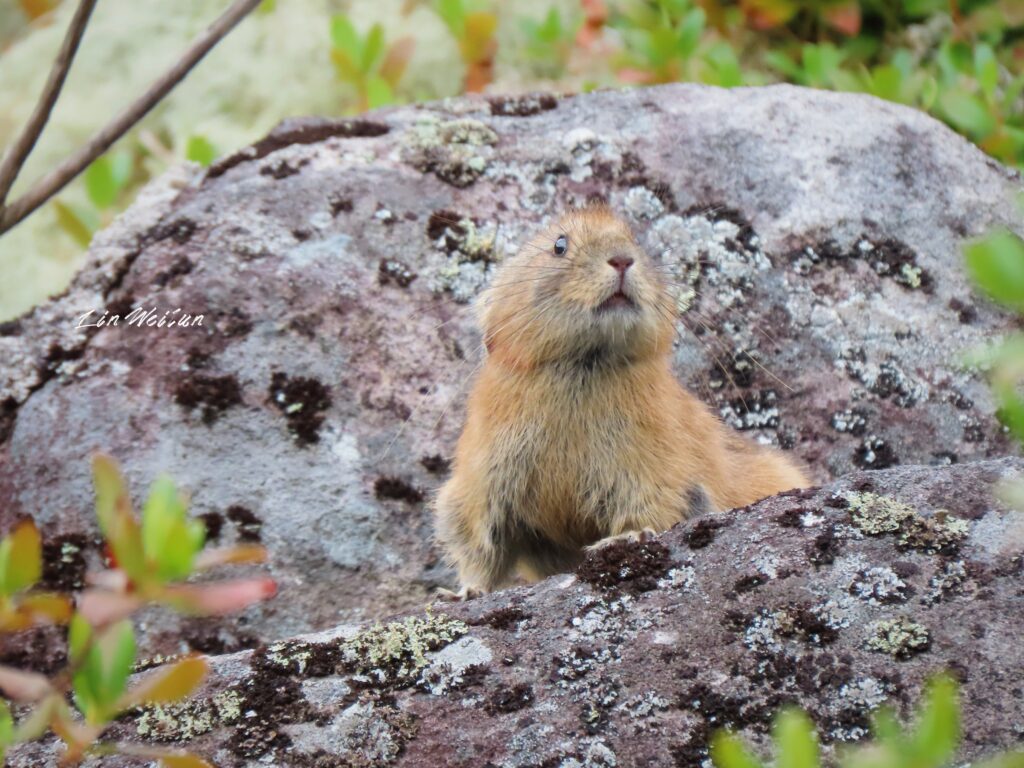 同時現場同好也說明,這隻蝦夷鼠兔由於是剛離開親獸,因此他不會叫,比較不能觀察到他鳴叫的行為也不能以叫聲尋找他,在這邊說明一下鼠兔由於常在棲息地以高音鳴叫「bi」,因此又有「鳴兔」的稱呼,當地人如果想觀察通常是以鳴叫聲來尋找蹤影,而觀察到最後,當我們即將離開時,眼中的鼠兔突然快速的移動,鑽到了高處,然後大聲的叫了一聲,哇塞真的超大聲的,現場的人也被這一聲bi逗樂,或許是我的一廂情願,但感謝蝦夷鼠兔在這趟北海道之行給與的美好回憶~