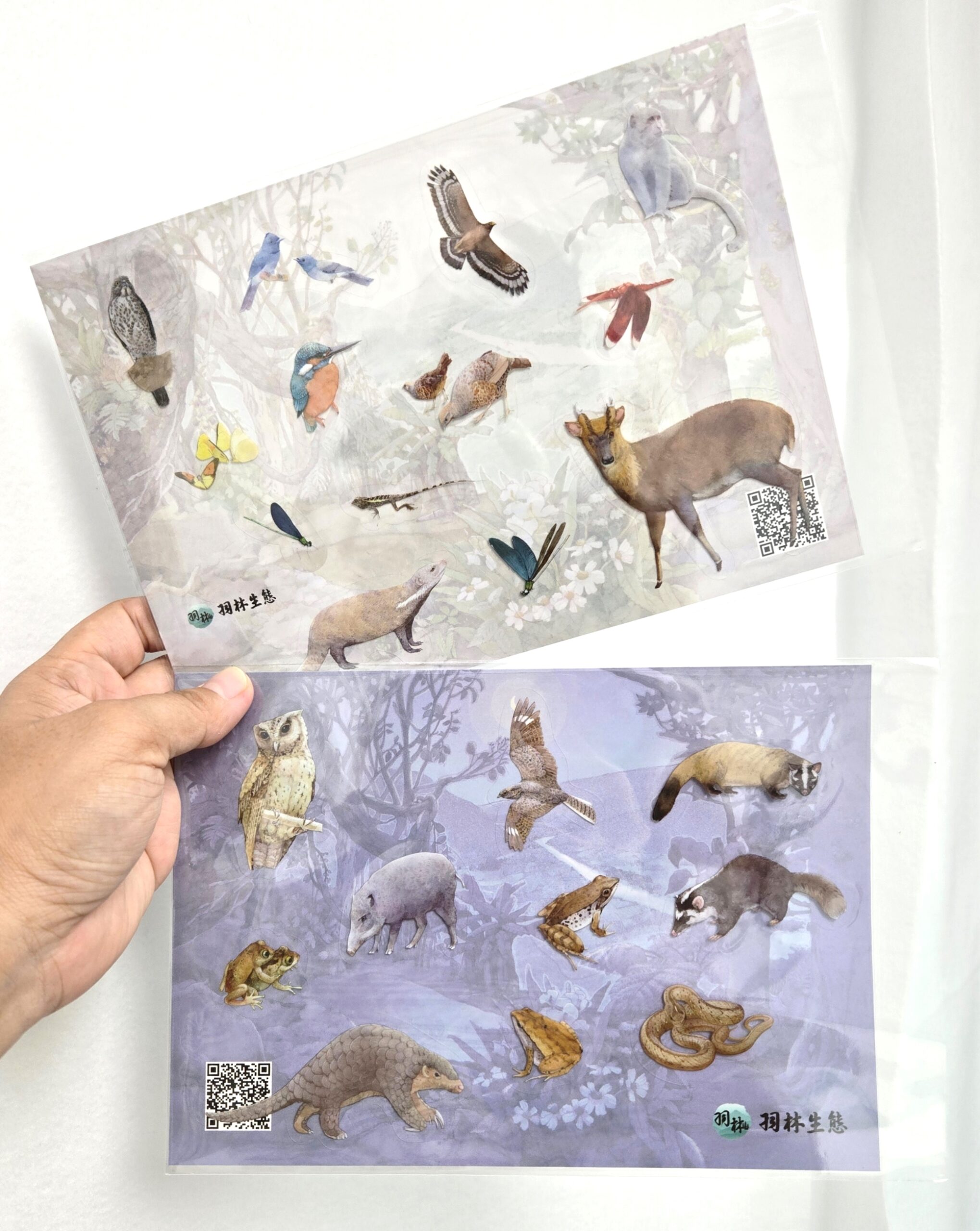 因為第一版的里山貼紙受到熱烈迴響,我們加碼再製,把貼紙的離型紙換成透明版本,貼紙改成透明膜增加色彩飽和度,摺頁背景圖也印成紙卡直接附在貼紙後方,讓更多人能透過這個推廣品認識臺灣的淺山環境樣貌與可能存在的動植物。