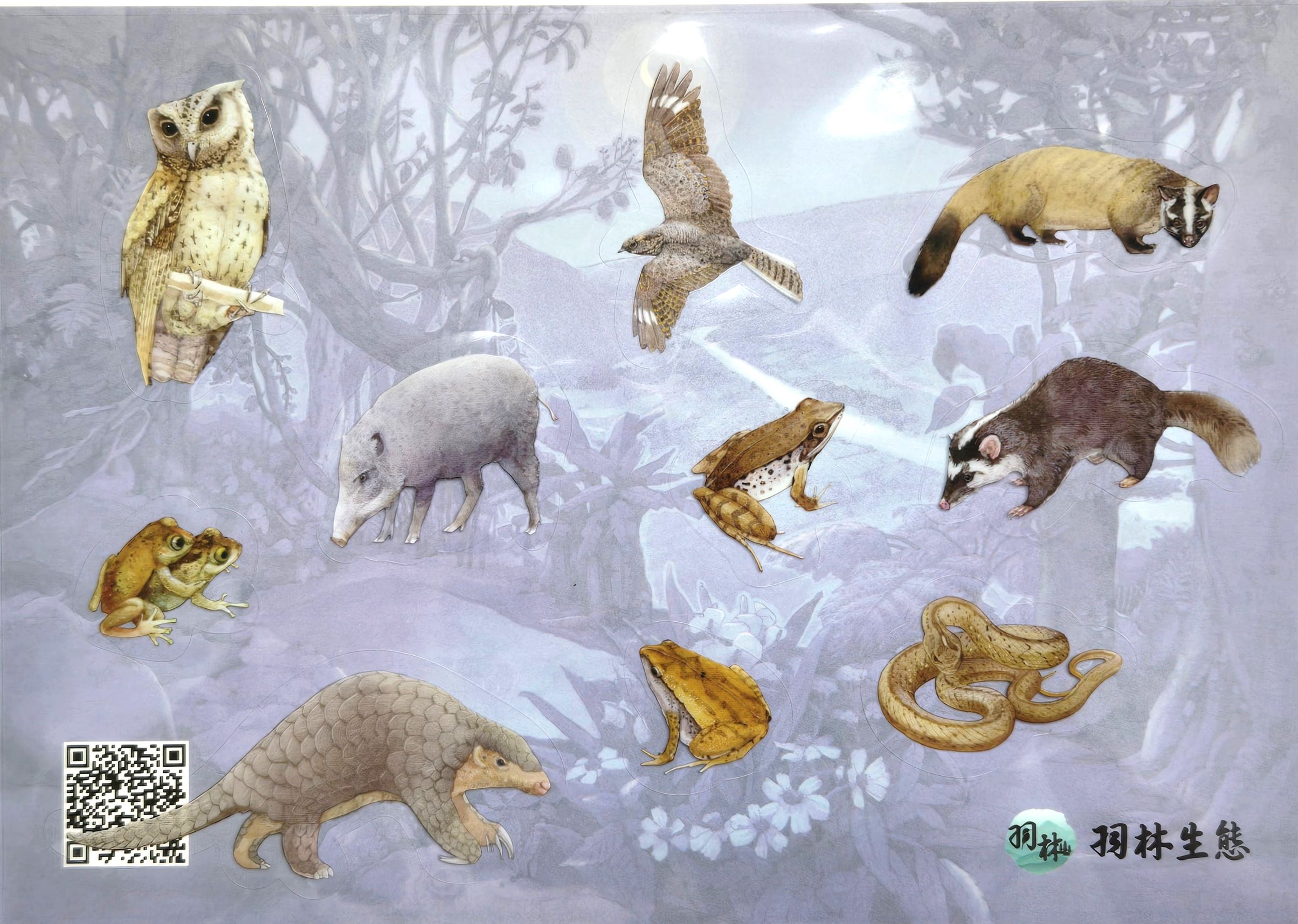這次同樣有日間與夜間版本,動物的選擇和第一版相同。日間版本我們選擇了善變蜻蜓、白痣珈蟌、異粉蝶、斯氏攀蜥、翠鳥、黑枕藍鶲、臺灣竹雞、大冠鷲、鳳頭蒼鷹、食蟹獴、臺灣獼猴、山羌等12種動物;夜間版本則是選擇了面天樹蛙、黑蒙西氏小雨蛙、腹斑蛙、茶斑蛇、南亞夜鶯、領角鴞、白鼻心、穿山甲、鼬貛、臺灣野豬等10種動物。